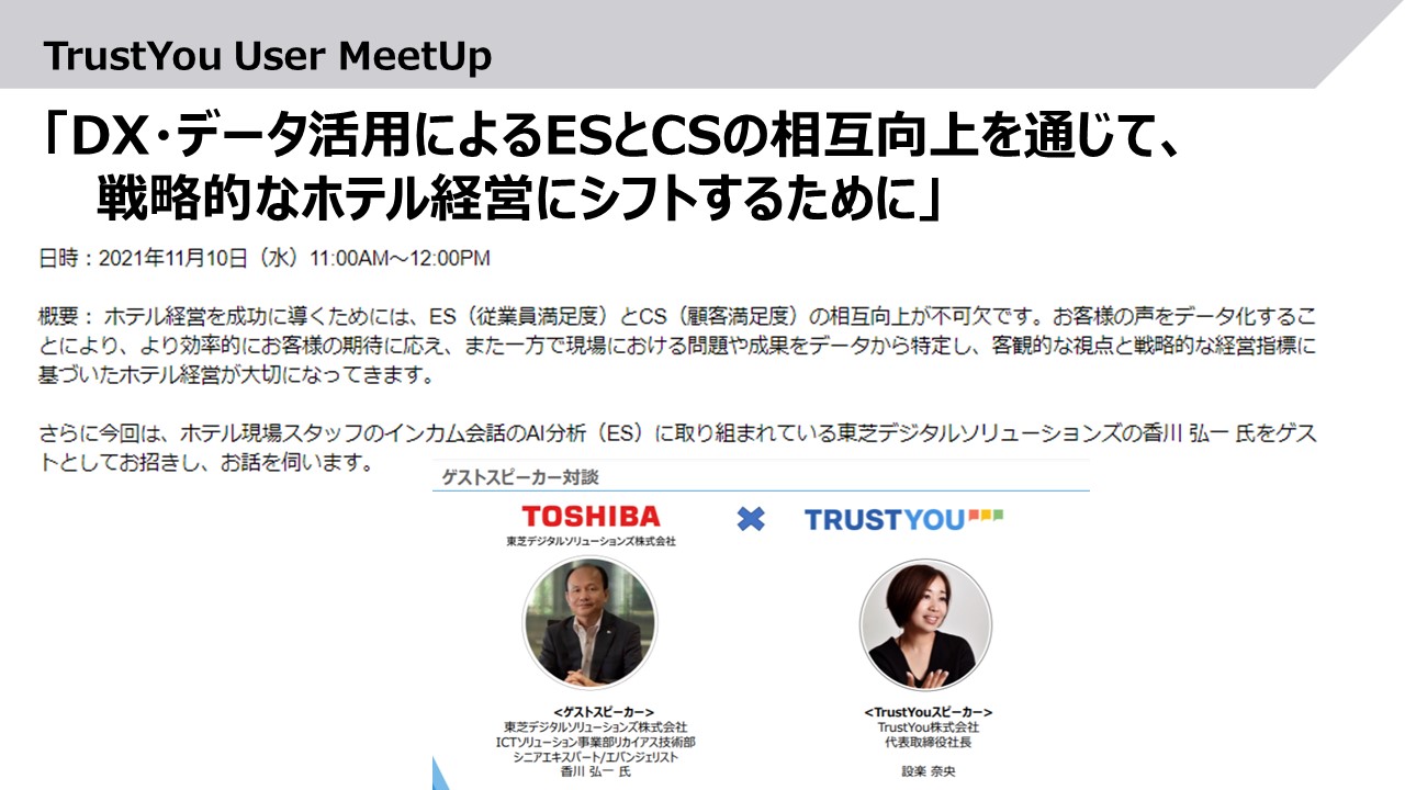 TrustYouでは、年に一回ユーザーの皆様と、クチコミのトレンドやTrustYouの活用方法を勉強する“ユーザー様向け勉強会(通称:ユーザー会またはUserMeetUp)” を開催しています。2021年は11月10日と17日に、オンラインで開催、本ブログでは、その内容の一部をご紹介いたします。