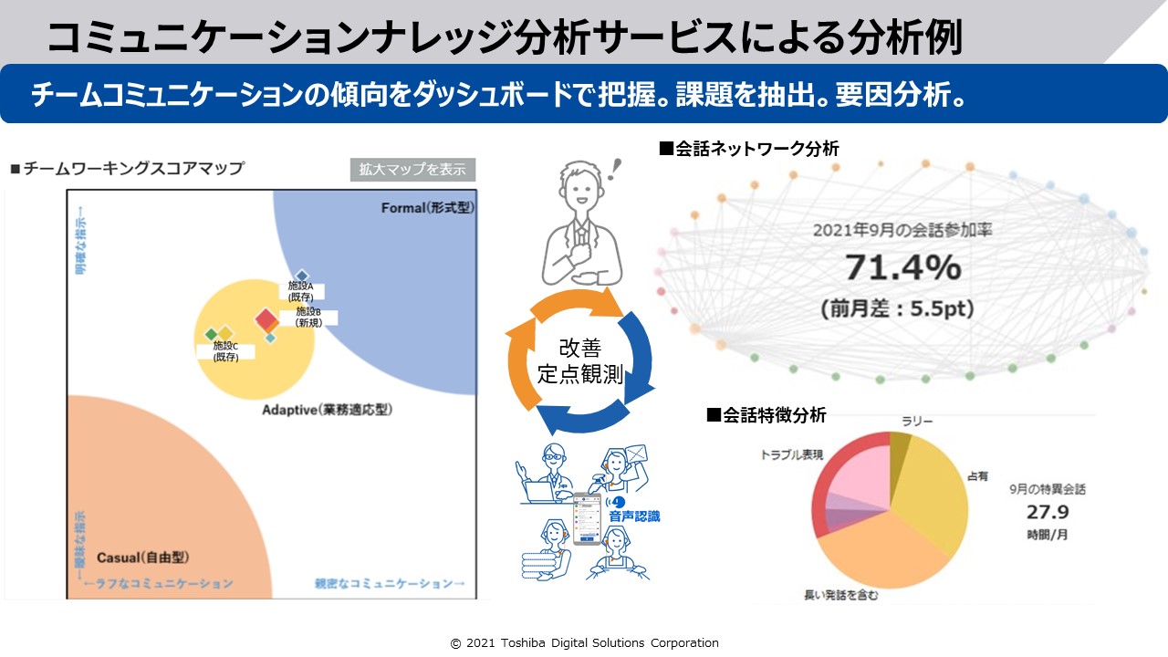 同じようにインカムで集めた現場のチームワークのデータを、RICAIUSの知識処理AIで自動的に可視化できるようになりつつあります。AIが可視化したダッシュボードに対して、業務の知見や知識を入れて、現場で何が起きていて、何を変えなくてはならないかを明らかにし改善に取り組む。そのような活動に役立つ新しい分析レポートサービスを開始しています。