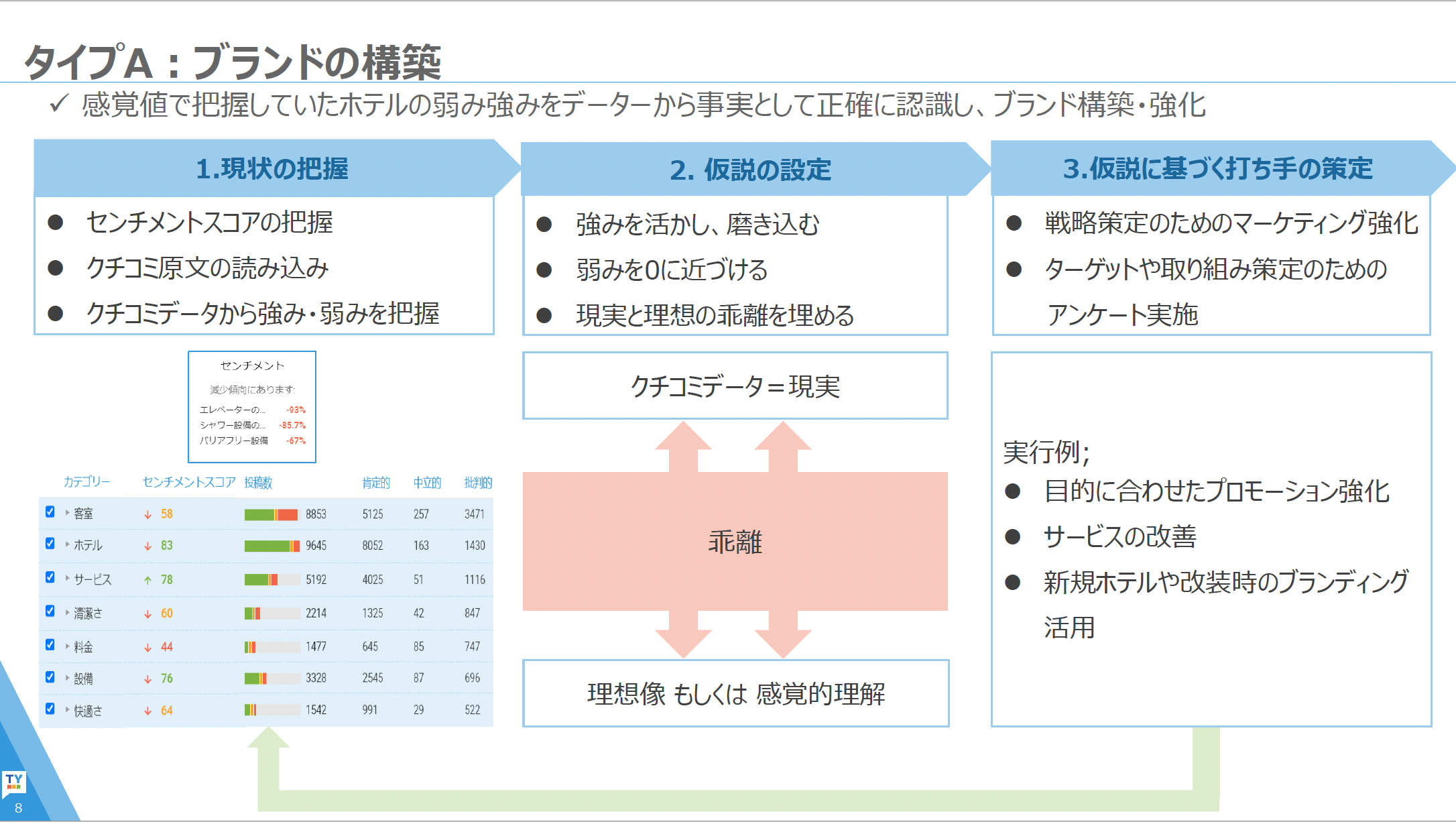 上記のホテル様では、「1. 現状の把握」、「2. 仮説の設定」、「3. 仮説に基づく打ち手の策定」の3つのステップで、ブランドの構築と強化に取り組んでいます。
