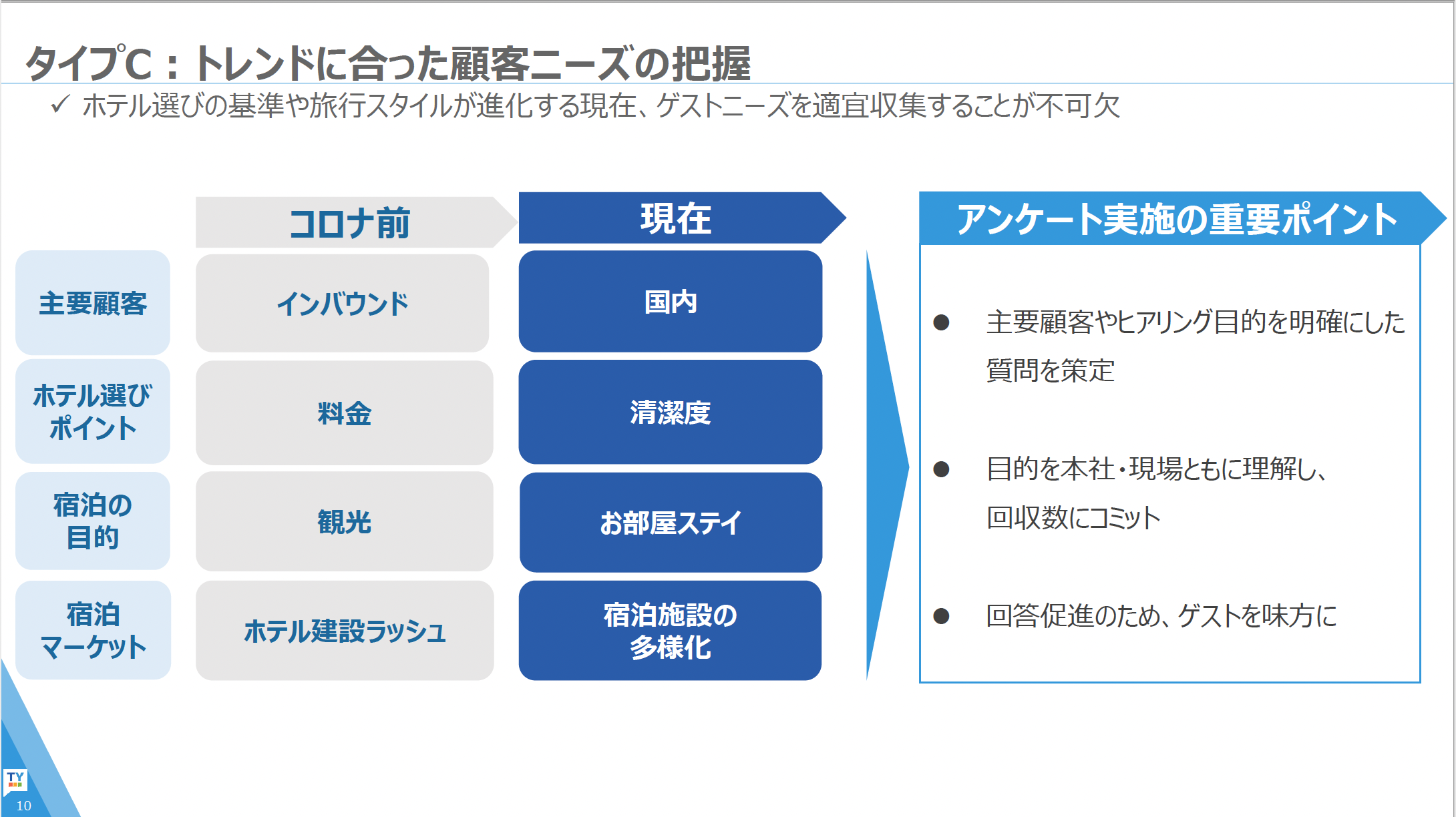 社会ニーズの変化に伴い、新しい顧客ニーズが出てきています。コロナ禍におけるホスピタリティ業界の主な変化としてゲストタイプの変化(インバウンド→国内)がありました。また、消費者のホテル選びのポイントとして、“コストパフォーマンス重視”から“安全性、清潔度の重視”へと変化しました。現在は旅のスタイルも、観光地中心ではなく、宿泊施設での宿泊体験がより重視される傾向も見られます。